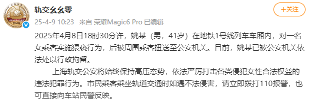 4月9日,上海市公安局城市轨道和公交总队官方微博@轨道幺幺零发布情况通报,内容如下: